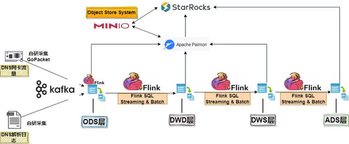 实时采集DNS流量数据,并通过Kafka将数据以消息的方式传送给Flink。使用 Flink 完成数仓 ODS 到 DWD 、DWS 和ADS层的计算,通过使用 StarRocks 对各层数仓做统一的 OLAP 查询和在线分析。基于 Kafka的消息订阅与消费,Flink 实现全链路的流式计算,加上StarRocks多层物化视图的聚合,数据从采集到分析的时延可被缩短到秒级,为安全监测与快速预警提供数据基础。