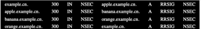 图2展示了一个DNS权威区为每一个主机记录生成的NSEC记录,这些NSEC记录首尾相连,形成一个环得以覆盖整个DNS区。具备激进缓存的递归服务器通过缓存上述记录中的最后一条便可知tomato.example.cn不存在于该区。若此4条记录全被缓存,则该区的所有不存在请求均可被递归服务器使用激进缓存技术进行合成。