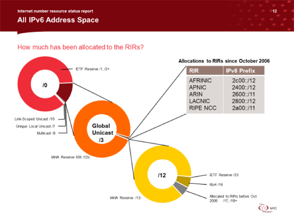 IPv6于1999年首次分配,IANA初期为RIR分配/23。 2006年10月,IANA为每个RIR分配了一个/12,以便更好地进行汇总并应用稀疏分配。在2019年,RIPE NCC和ARIN都申请了第二个/12 IPv6分配。