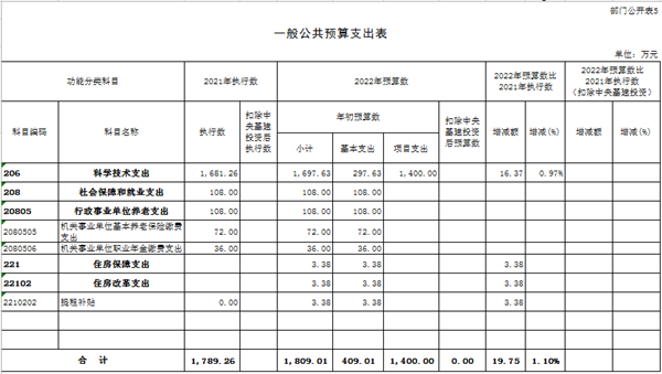 (一)科学技术支出2022年年初预算1697.63万元,比2021年执行数增加16.37万元,增加0.97%。主要原因是:2022年相关机构运行支出增加。