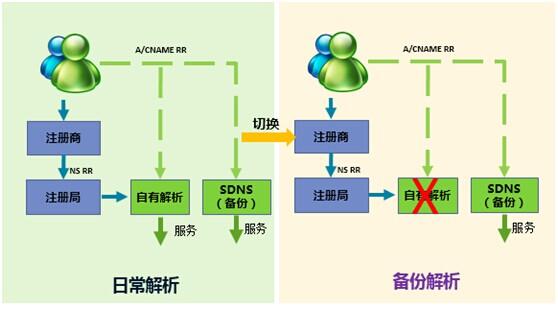 The authoritative resolution data of user's domain name is backed up to the cloud resolution platform. Under normal circumstances, the user's self-hosted authoritative server provides DNS resolution services. In the event of an emergency or service migration, users can update the NS records to point to the SDNS authoritative cloud platform, which will then continue to provide domain name resolution services.